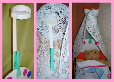 Il cuscino invece l'ho cucito con ago e filo, due pezzi di pile con dell'imbottitura all'interno. Il lenzuolino è un fazzoletto mentre la tendina bianca è un pezzo di tendina del bagno. Ho fissato con la colla una molletta per i panni ad una stecca di plastica e all'altra estremità il tappo del barattolo della nutella. Al tappo ho fissato la tendina con la colla e poi coperto la sommità con un cerchio di pile.