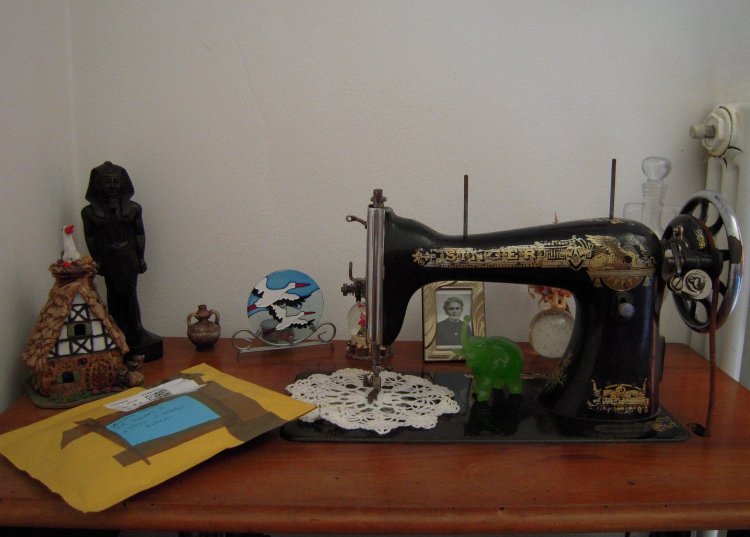 La mia nonna ha sempre aiutato una sarta che abitava nella casa di fronte alla sua, mi pare si chiamasse Luisa. Quindi la si poteva trovare in casa, al cimitero o dalla sarta. Questa macchina per cucire era della nonna ed ora è nella mia camera da letto. Io non so cucire e non ho la passione per ago e filo però questa macchina ha un grandissimo valore affettivo. Mi hanno raccontato che durante la guerra questa macchina per cucire era stata nascosta in giardino, sotto terra, per evitare che venisse rubata. Dopo la guerra è stata riportata in casa e credo che il mobile di legno non sia originale ma rifatto appunto negli anni dopo la guerra.