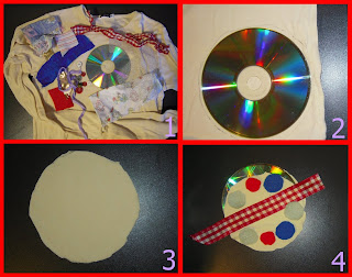 Come ho cucito tutte le decorazioni? Ho sovrapposto due cerchi di tessuti uguali o diversi, ho cucito attorno fino a metà e poi ho inserito un cd all'interno. Ho continuato a cucire fino a chiudere il cd all'interno dei due cerchi di tessuto fissando una cordicella o un nastrino per poter appendere la decorazione.