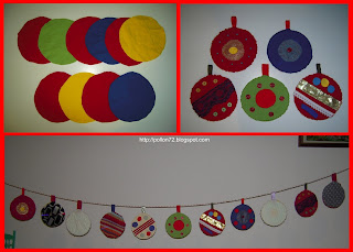 Alcune decorazioni le ho create cucendo due cerchi di tessuto identico che ho decorato ed altre con un cerchio di tessuto ritagliato da una maglietta per il retro e uno diverso, smacchinato o con qualche fantasia che mi piaceva particolarmente per il davanti. Il risultato finale è davvero bello. Ricordano le palline per l'albero di Natale perchè sono rotonde, si possono decorare a piacere, (io non ho esagerato con perline o luccichini vari), e si possono utilizzare tessuti di ogni genere, maglioni infeltriti, t-shirt macchiate o indumenti dei bimbi cresciuti. Si può usare anche il feltro o pannolenci ma a me dispiaceva sprecarlo quando potevo sostituirlo benissimo con ritagli di tessuto vario. Occorre davvero poco tempo per farne una decina, io ho lavorato tutto un pomeriggio piovoso in cui non si poteva uscire.