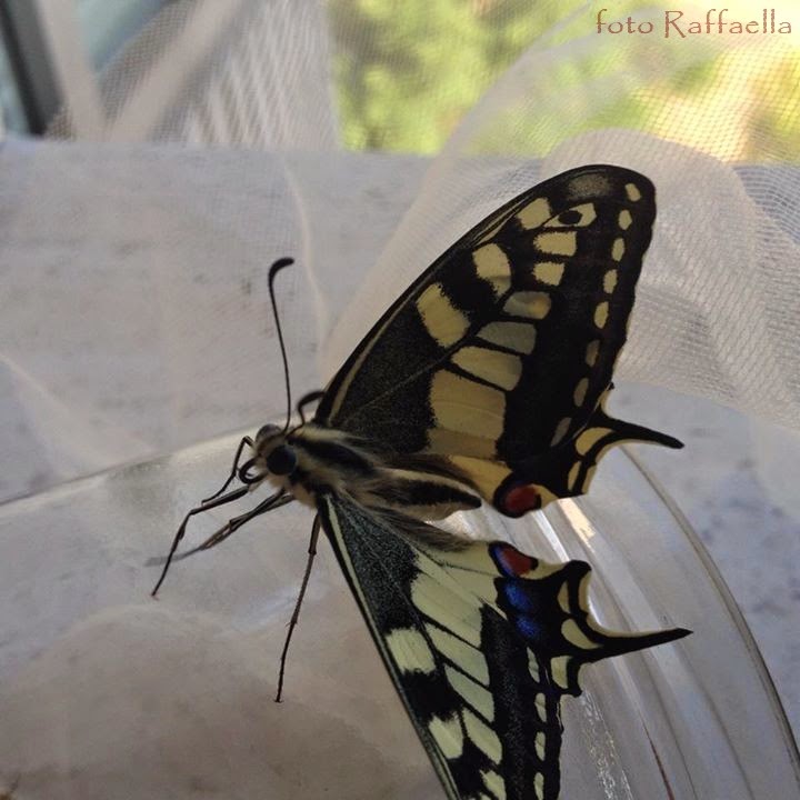 Qui sotto il Topastro mentre prova il bruco come sciarpa prima della consegna e più sotto alcune foto scattate nel nostro cortile di casa: la farfalla nata dal bruco Macaone! Anche nel nostro giardino, o qui vicino, un bruco si è trasformato in farfalla. Chissà se riusciremo ad avvistare anche un bruco. In ogni caso non credo lo porterei a casa, mi fanno troppa impressione gli insetti di ogni tipo e anche le farfalle le osservo da lontano :-D