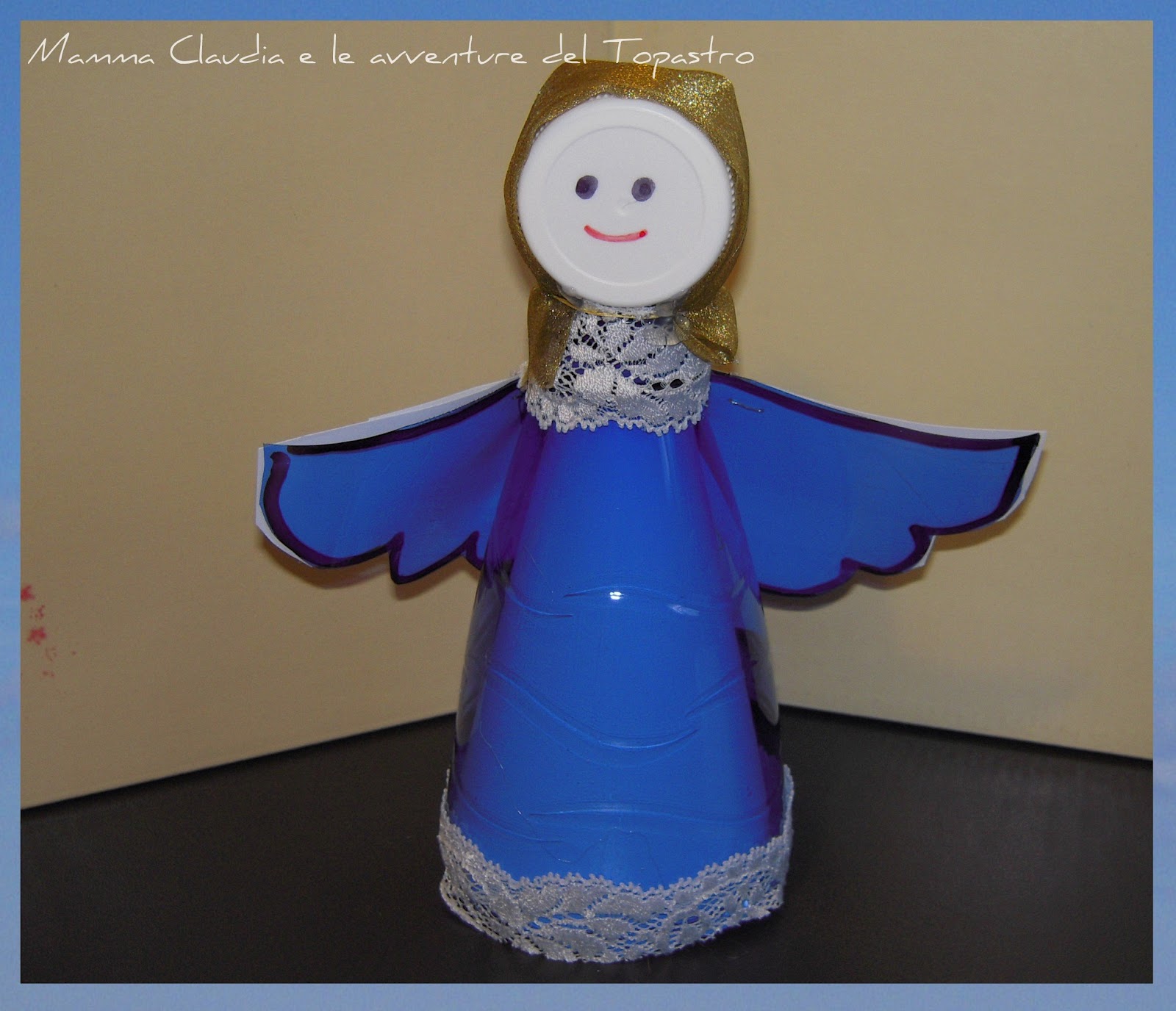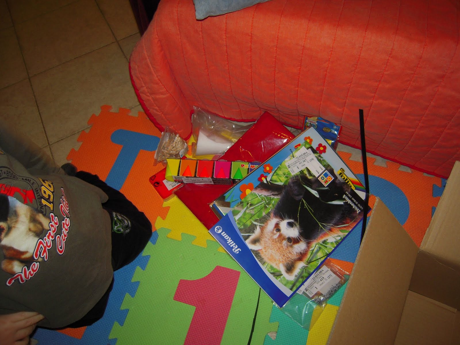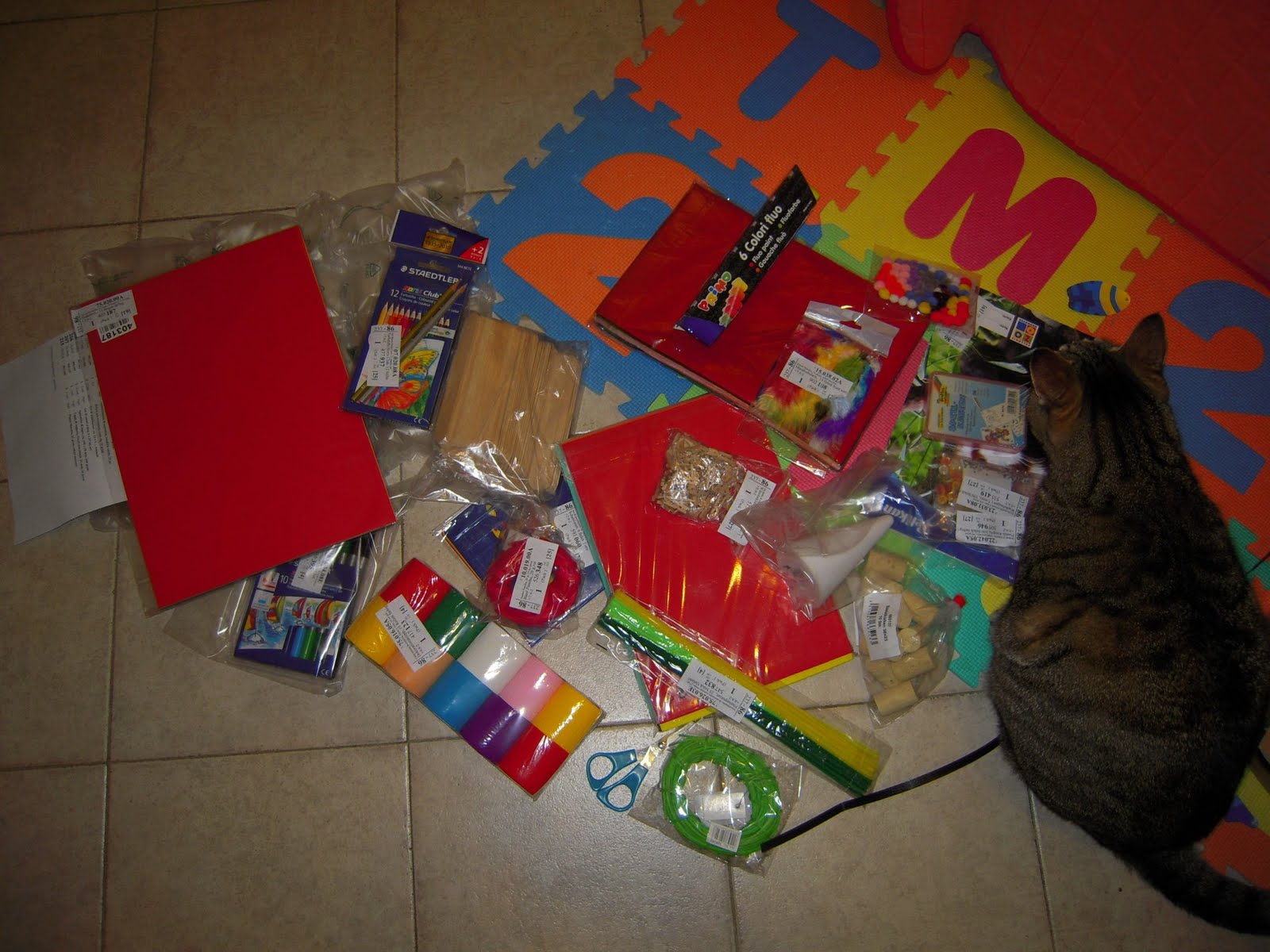 Io e Topastro abbiamo estratto uno ad uno gli oggetti dalla scatola. Anzi: io fotografavo e Topastro estraeva: piccoli pompons colorati, piccolissimi occhietti con le pupille mobili, bottoni colorati, colori a dita, mollettine di legno in miniatura, carte da giochi, fogli di gomma crepla, carta crespa...