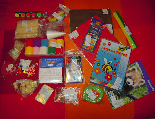 Io amo creare ma non compro spesso materiale, la maggior parte delle volte utilizzo materiali di riciclo, oggetti che non uso più... In parte perchè è divertente dare nuova vita ad un oggetto usato, modificarlo, cambiargli utilizzo... D'altra parte i materiali per creare degli oggettini graziosi sono abbastanza costosi, anche se bellissimi! Con tutti questi materiali riuscirò a creare delle cose super! Perchè oltre alle cose elencate sopra c'era tanto altro! Un cono di polistirolo, fogli da disegno, pennarelli a doppia punta, pastelli, (anche il color oro e argento), nastro panchu, scovolini, feltro, mascherine per disegnare gli animali, spatolette di legno, tappi di sughero e piume colorate!