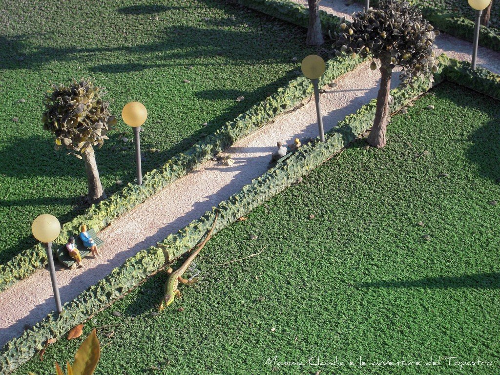 Ecco Topastro accanto alla Torre di Pisa e sotto a bordo della monorotaia che, sospesa ad alcuni metri da terra, effettua il giro del parco. I monumenti sono quelli che ricordavo da piccina. La parte dedicata all'Europa, (piccola), c'era quando ho effettuato le ultime due visite mentre non ricordo proprio la parte dedicata a Venezia, (5 volte più piccola rispetto all'originale), che non abbiamo avuto tempo di visitare.