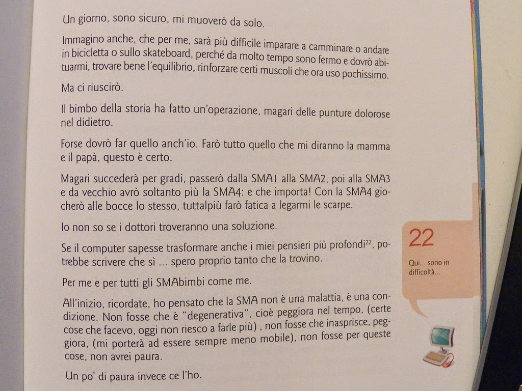 Nessuno dei miei lettori può dire di non conoscere Famiglie SMA di cui vi ho parlato tante volte e quando ho scoperto che era stato pubblicato un libro che raccontava una storia magica sul piccolo Christian, affetto da SMA 1, ho subito avuto voglia di leggerlo. Voi sapete che amo i libri e visto che questo in particolare aiuta i bimbi con la SMA ho pensato che doveva per forza essere mio. Questa è stata la motivazione principale e spero di non offendere nessuno dicendo che non mi aspettavo un libro così bello. Pensavo che nel libro fosse raccontata la storia del bimbo con gli occhi blu più belli che io abbia mai visto, (mi avevano colpito molto un anno e mezzo fa), in maniera classica e magari pure scritta così così.